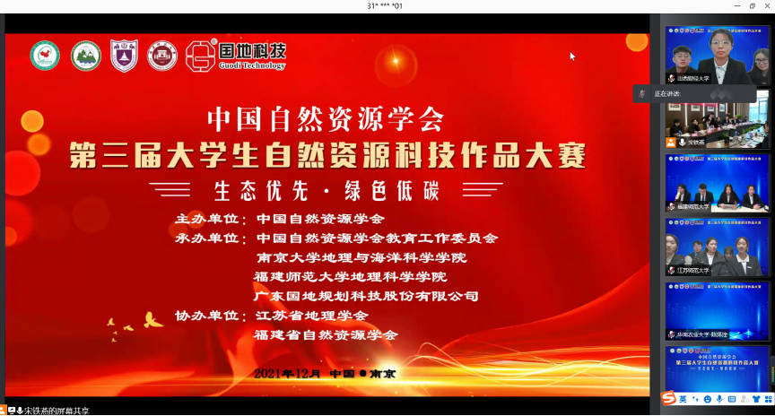 由中国自然资源学会主办,中国自然资源学会教育工作委员会、南京大学地理与海洋科学大发体育 、福建师范大学地理科学大发体育 、广东国地规划科技股份有限公司承办,江苏省地理学会、福建省自然资源学会协办的第三届大学生自然资源科技作品大赛决赛于2021年12月12日通过线上方式在南京举行。大发体育 土地资源管理专业“护超联盟”代表队参赛作品《产业转型背景下山西省碳排放影响因素与低碳化发展对策研究》喜获大赛二等奖。