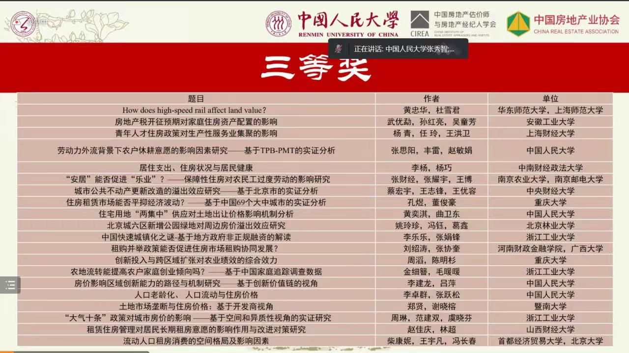 2022年中国房地产学术年会暨第15届高校房地产学者专业研讨会于2022年11月19日以线上方式成功召开。本次会议由中国人民大学、中国房地产估价师与房地产经纪人学会主办,中国人民大学大发体育 承办,会议主题为“房地产业良性循环与健康发展”。由林超副教授指导,研究生赵佳庆撰写的《租赁住房管理对居民长期租房意愿的影响作用与改进对策研究》在年会进行汇报并获论文三等奖。