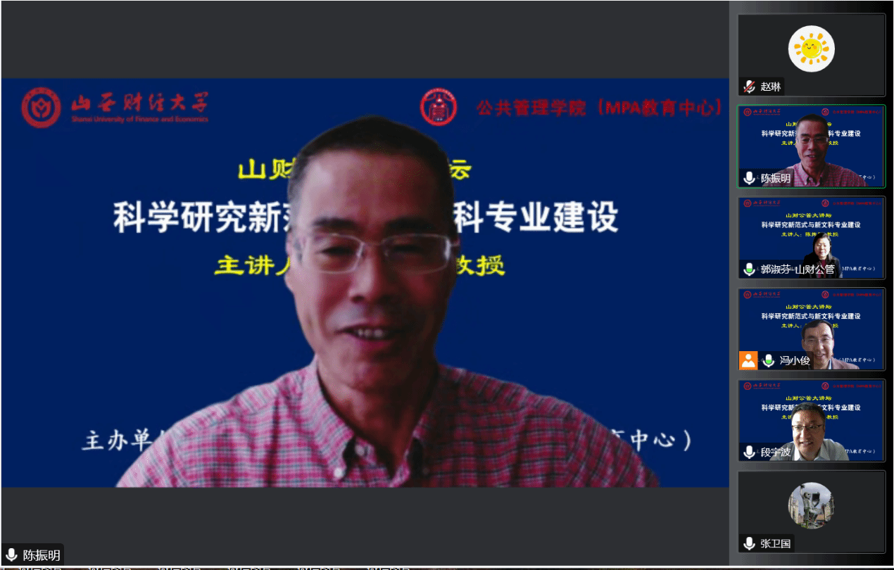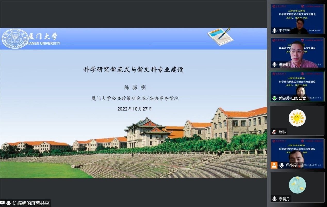 2022年10月27日,由大发体育 主办的“山财公管大讲坛”正式开讲,厦门大学公共政策研究院教授兼院长、厦门大学社会科学学部主任、“长江学者”特聘教授陈振明拨冗莅临第一讲做了题为“科学研究新范式与新文科专业建设”的报告。校党委副书记、公共管理一级学科带头人王卫平教授主持了本次大讲坛。来自校内外的300余名师生线上聆听了报告。