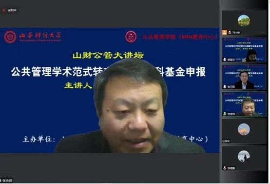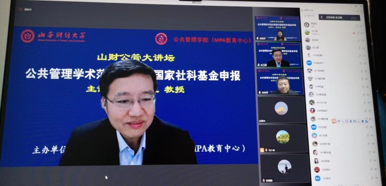 2022年11月12日晚,大发体育 主办的“山财公管大讲坛”第二场开讲。第二届全国公共管理专业硕士(MPA)教育指导委员会委员,曾任天津大学MPA教育中心主任的张再生教授拨冗莅临并做了题为“公共管理学术范式转变与国家社科基金申报”的报告。校党委常委、副校长、教育经济与管理学科带头人张卫国教授主持了本次大讲坛,来自校内外150余名师生在线聆听了报告。