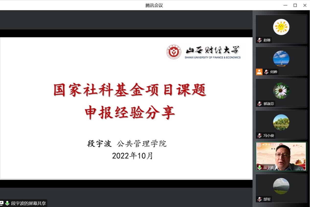 副院长、2022年国家社科基金项目主持人段宇波副教授做了《国家社科基金项目课题申报经验分享》的报告,副院长冯小俊主持了交流会,100余名师生在线参加了经验交流会。