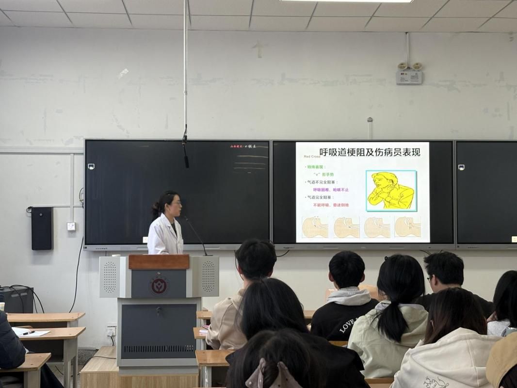 在急救技能教学环节,医护团队通过“讲解+实操”的方式,重点演示了心肺复苏规范流程,从胸外按压的部位、深度、频率,到开放气道、人工呼吸的操作要点逐一拆解示范,并纠正常见操作误区。同时,团队还讲解了海姆立克急救法的应用技巧,以及其他相关常见突发状况的处置方法,传授了低血糖“15-15原则”、呼吸性碱中毒可通过罩住口鼻促进二氧化碳重吸入等实用技巧。现场学生踊跃参与实操练习。