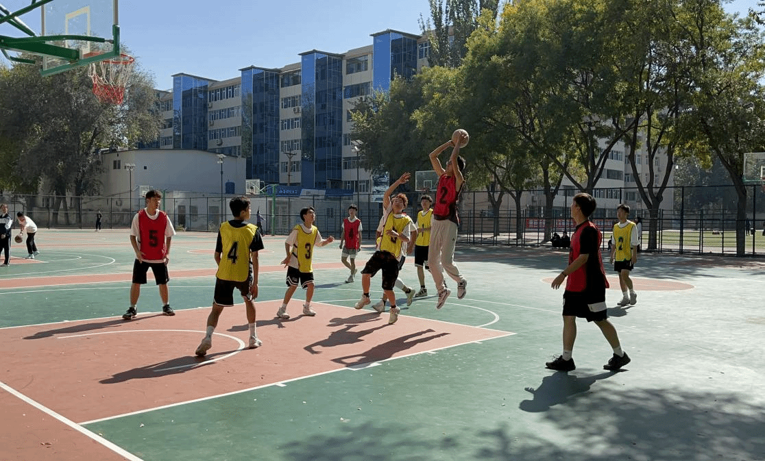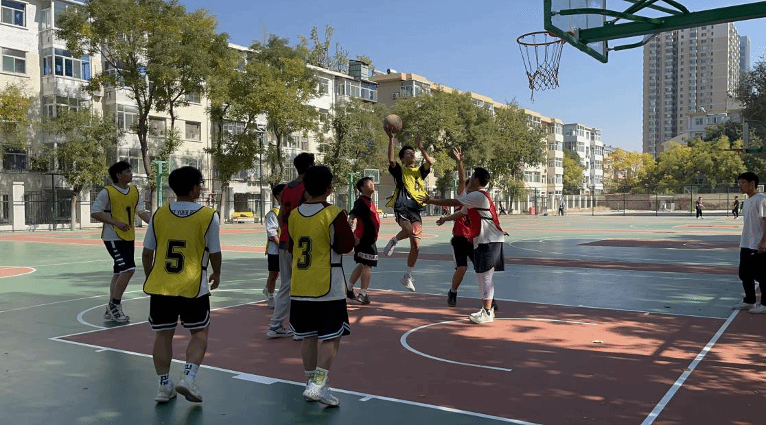 落日融金,暮云合璧。骄阳下,男篮决赛激烈进行着,随着球员左晃、右晃、过人、起跳、钩手,一个漂亮的三分球夺框而入,“球进了!”双方队员在篮球场上肆意挥洒汗水,使用精湛的篮球技术和周密的策略,完成了一次次紧密配合和精准投球,为自己的队伍不断赢得分数。