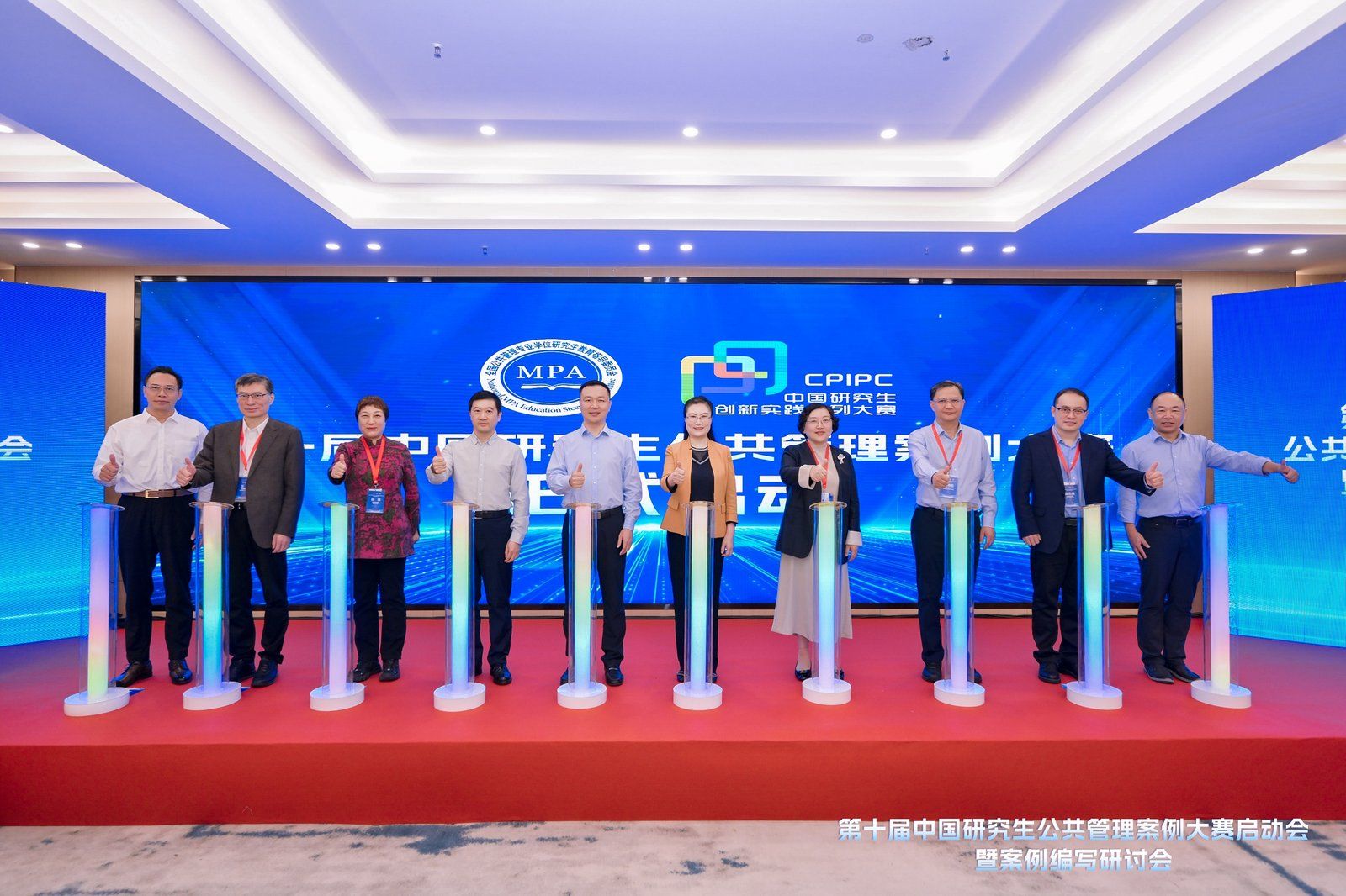 党委书记何燕辉等领导和专家亲临开幕式现场。MPA教指委秘书长严金明教授通过线上方式出席并致辞。在全体与会嘉宾和参会师生的共同见证下,刘丽军、吴报水、胡锴、姜晓萍、孙萍、蔡劲松、赵志荣、王健、周忠良、何燕辉等领导共同按下启动按钮,正式拉开了第十届中国研究生公共管理案例大赛帷幕。
