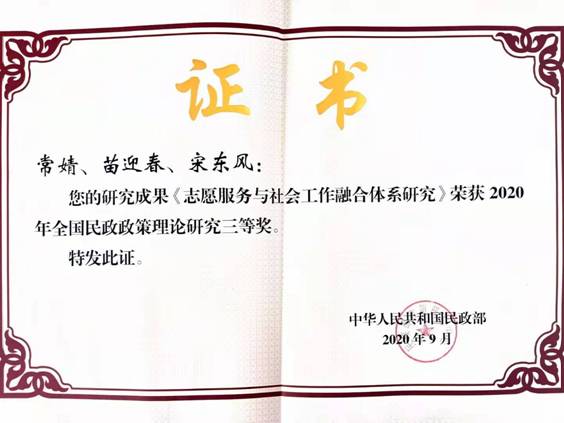 党建工作样板支部。承担两项校级党建课题研究并顺利结题。辅导员常婧老师主持的课题《志愿服务与社会工作融合体系研究》获2020年全国民政政策理论研究成果三等奖。